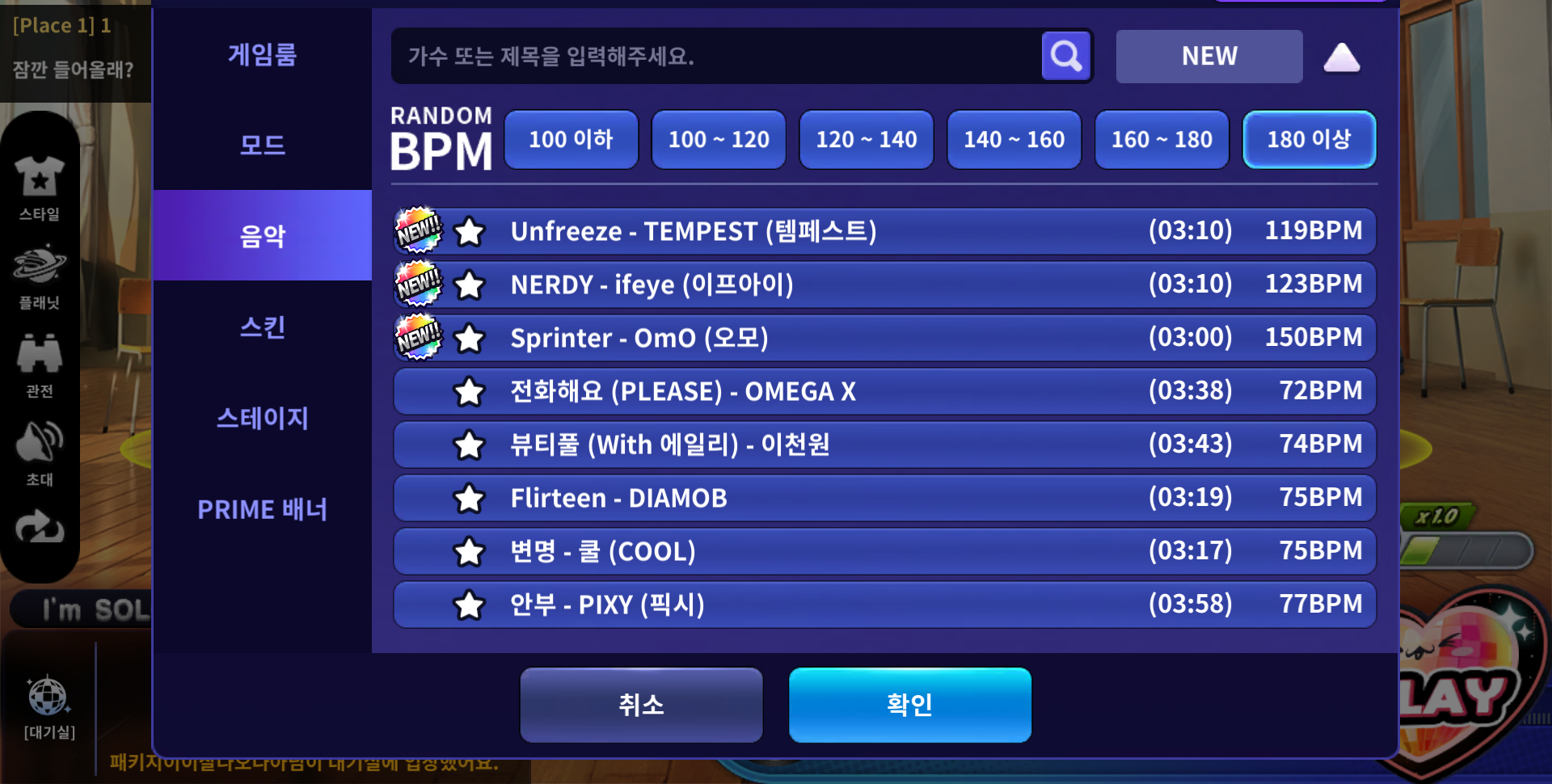 📌게임룸 설정에서 BPM 선택 항목이 개편되어, [160 이상] 버튼은 [160~180]으로 변경되고, [180 이상] 버튼이 새롭게 추가됩니다.
