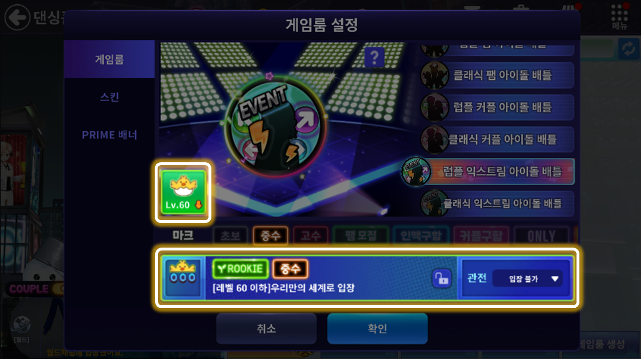 📌 댄싱홀 게임룸 생성 시 특정 레벨 이하만 입장 가능하도록 설정할 수 있는 [루키방 시스템]이 추가됩니다.